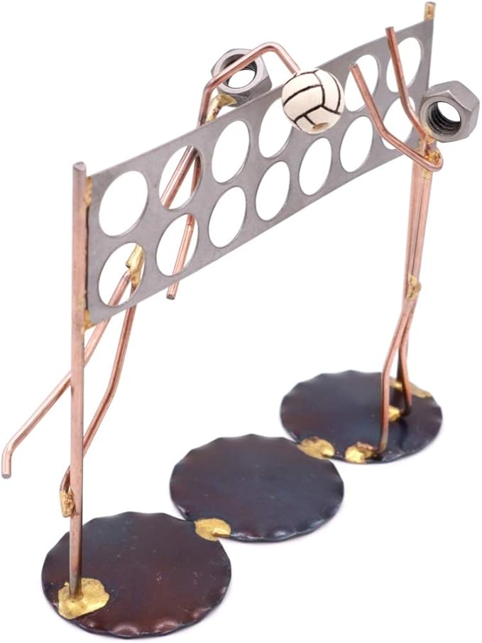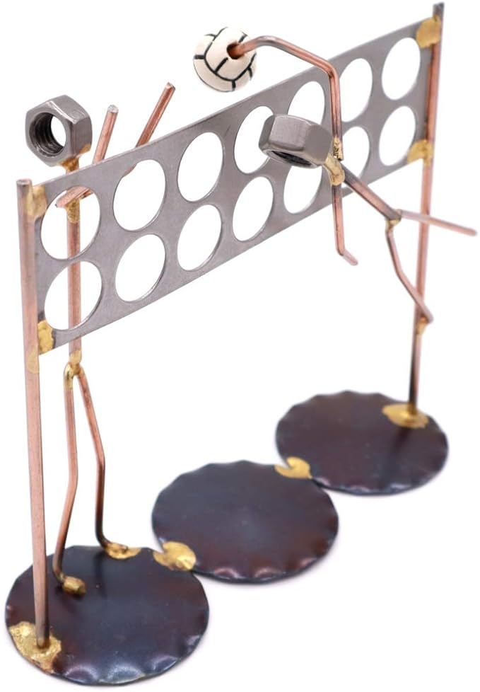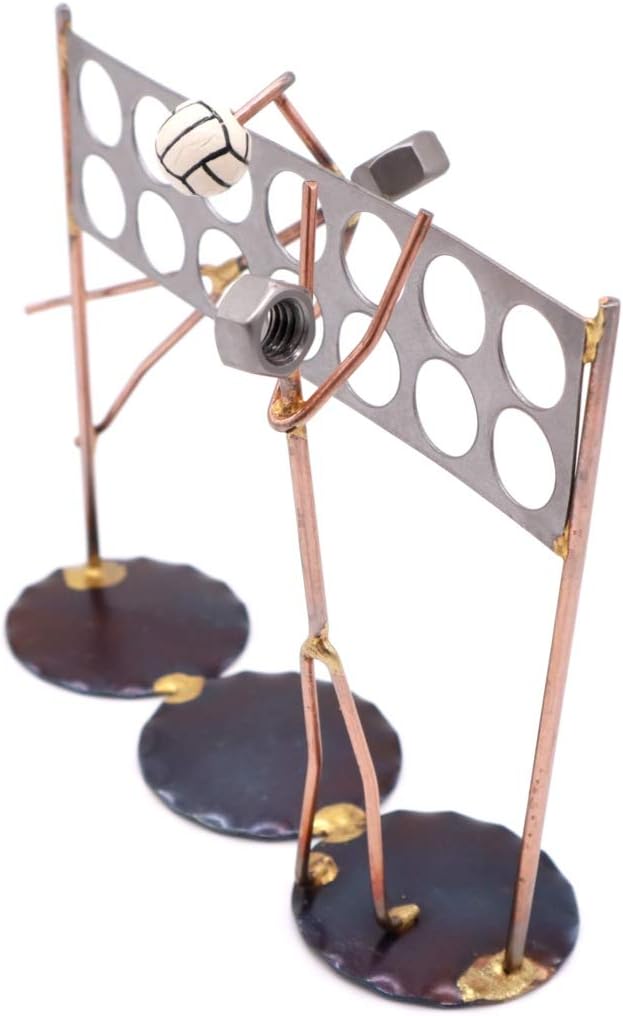 - VOLLEYBALL NET WITH MEN figure is crafted from nuts, brazing rods, washers, steel and is great to use as a trophy or to accompany your business cards for a fun, eye-catching desk accessory. (The business cardholder may be purchased separately.) Approximately 5″ tall by 7″ wide.