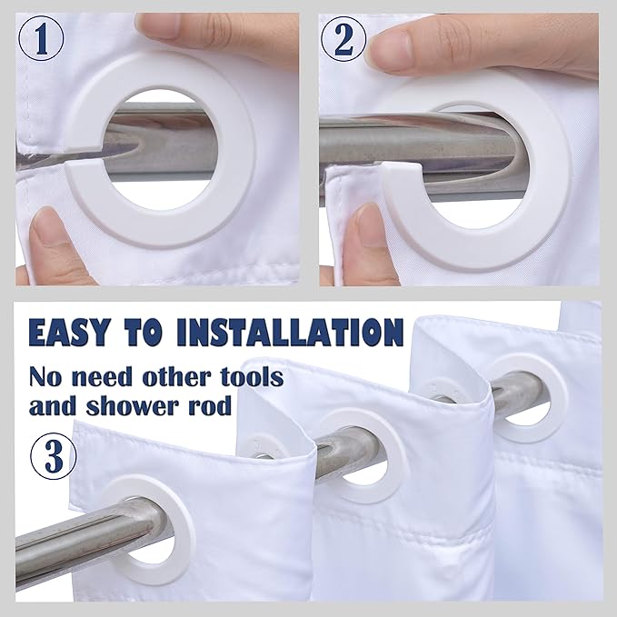 - SUPER EASY TO INSTALL : This shower curtains design with High Quality Flex On Rings that you can very easy to install it in one minute.Smart design will made it easier to hang and to slide along the pole.