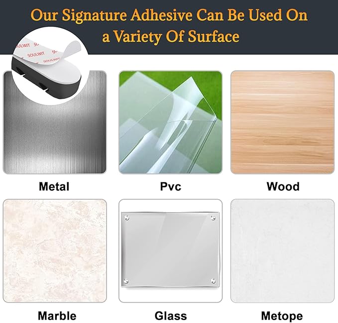- 🔷The double-faced adhesive is very firm and long-lasting and works well in smooth and clean the surface, such as marble, plastic, wood, glass, metal, and rubber.