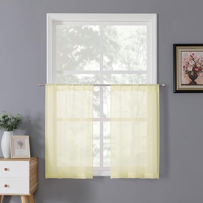 Tollpiz Sheer Tier Curtain Linen Textured Half Kitchen Curtains Sheer Light Filtering Rod Pocket Voile Small Curtains for Bathroom, 25 x 36 inches Long, Transparent Yellow, Set of 2 Panels