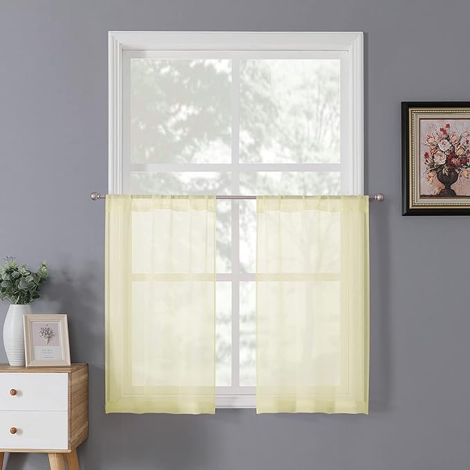 Tollpiz Short Sheer Tier Curtains Linen Textured Half Kitchen Curtain Sheers Light Filtering Rod Pocket Voile Small Curtain for Bathroom, 25 x 24 inches Long, Transparent Yellow, Set of 2 Panels