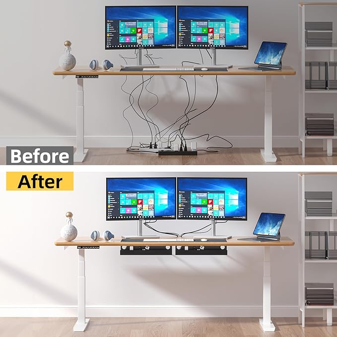 - Enough Space for Use: Total length of cable are 31.5 inch,the top opening and sidewall cutouts design make your computer cables on your desktop can pass freely, prevent wires from tangling, especially when you moving the desk up and down.To clean up all of your cable clutter. Hiding power strip and loose cables not only frees up desktop and floor space but also prevent tripping hazard