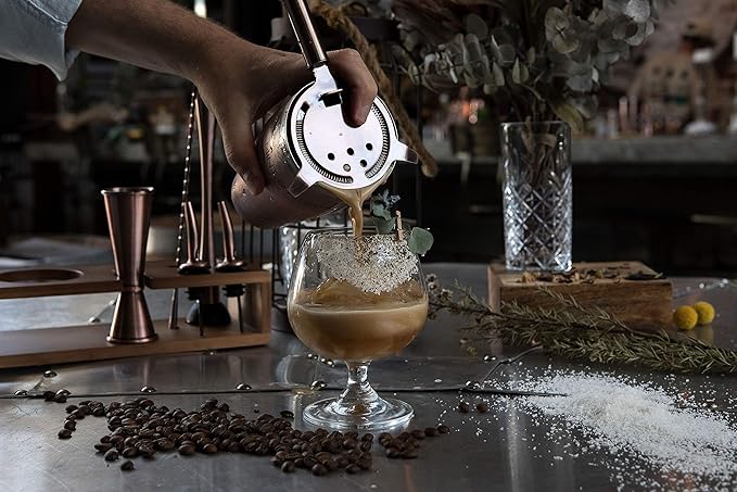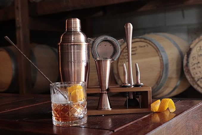 - COMPACT BARTENDING KIT: All the accessories you need for a perfect cocktail mixing night. Our copper cocktail shaker comes with the essential mixology tools including a 24oz Cobbler Shaker Double (1Oz / 2Oz) Jigger Hawthorne Strainer Mojito Muddler Teardrop Stirrer Bar Spoon, and 2x Liquor Pourers; together with a sustainably sourced bamboo stand will get you making drinks like a pro!