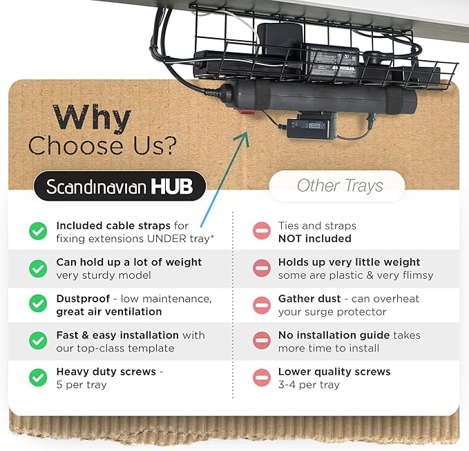 - Easily Mounted: The under desk cord organizer tray installs to the bottom of any wood, MDF, or particleboard desk. You can even mount it on the wall and use it as a cable management wall unit. Not suitable for installation on paper honeycomb-filled desks like some IKEA office desks - Linnmon and Skarsta.