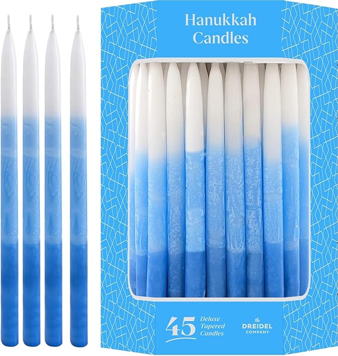 - BLUE & WHITE DECORATED: These classic two-toned candles will really brighten your Chanukah experience. A clean white top shades into a bright sky blue bottom with cornflower blue & white designs.