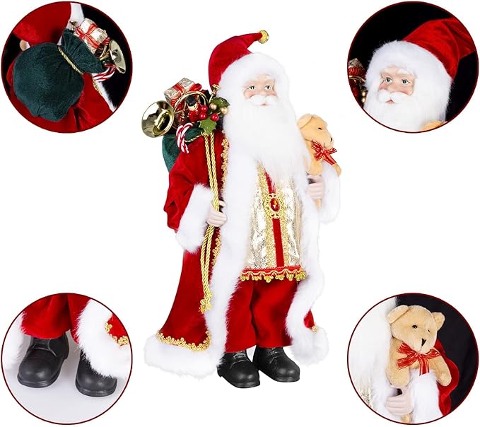 - 🎅Christmas decorations★Lovely Look: The classic Santa Claus Figurines with a big white beard is wearing his long red velvet slim coat and black leather shoes. It can be stable on any surface.