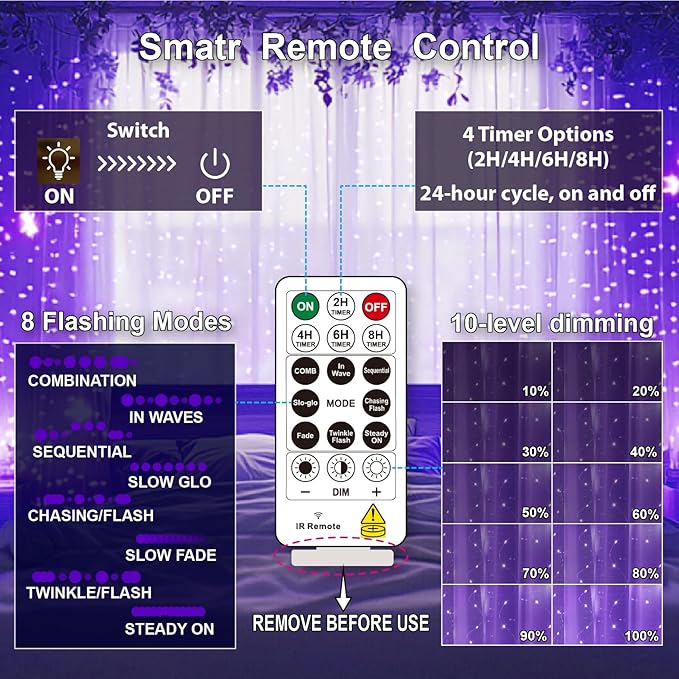- 8 Modes and Timer: Unlike others, our 17-Keys remote added 4 timing modes (2/4/6/8 hours on, 22/20/18/16 hours off); 8 different flash modes to choose from, and you can adjust the brightness by pressing "dim" ,“+” and "-"; That are all controlled easily with a wireless remote from a distance of 10 to 15 meters, aim at the USB receiving direction when you press; All is in your control