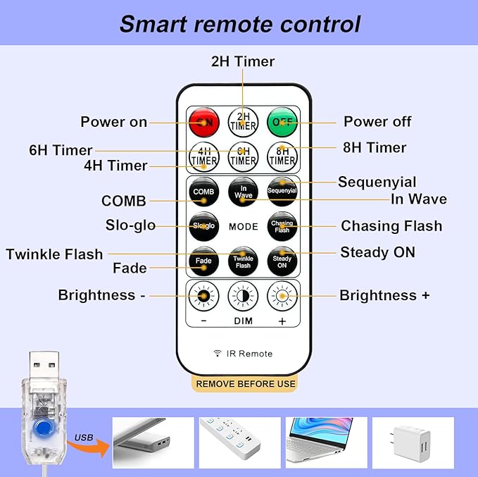 - Upgraded USB 8 Mode Remote Control String Copper Light: Each mode will bring you a different romantic atmosphere, including combination, in waves, sequential, slogs, chasing/ flash, slow fade, twinkle/ flash, and steady on; USB powered, which can be used by plugging it into the computer, power bank or USB interface
