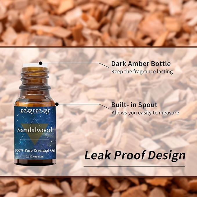 - Packing Includes: 10ml Sandalwood Essential Oil x1, 10ml Vetiver Essential Oil x1. With no adulterants or dilution, 100% pure quality. BURIBURI scented oil is bottled in a durable amber glass bottle.