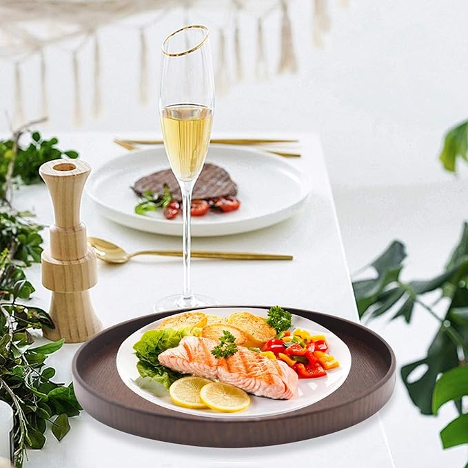 NC Solid Wood Serving Tray, Round Non-Slip Tea Coffee Snack Plate Food Meals Serving Tray with Raised Edges for Home Kitchen Restaurant (8.2inch, Brown)