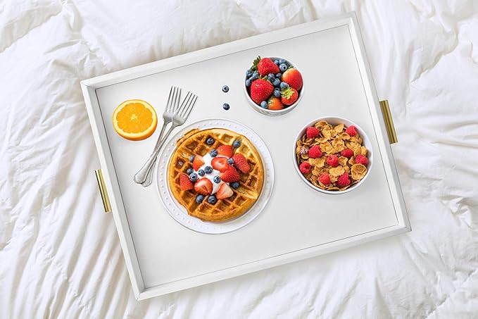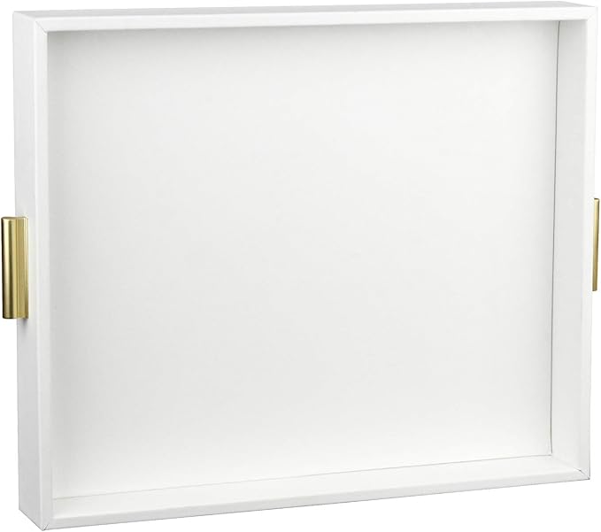 HofferRuffer Extra Large Serving Tray with Handles, Elegant Faux Leather Storage Decorative Tray for Coffee Table, Ottoman, Console Table (White Tray+Golden Handle)