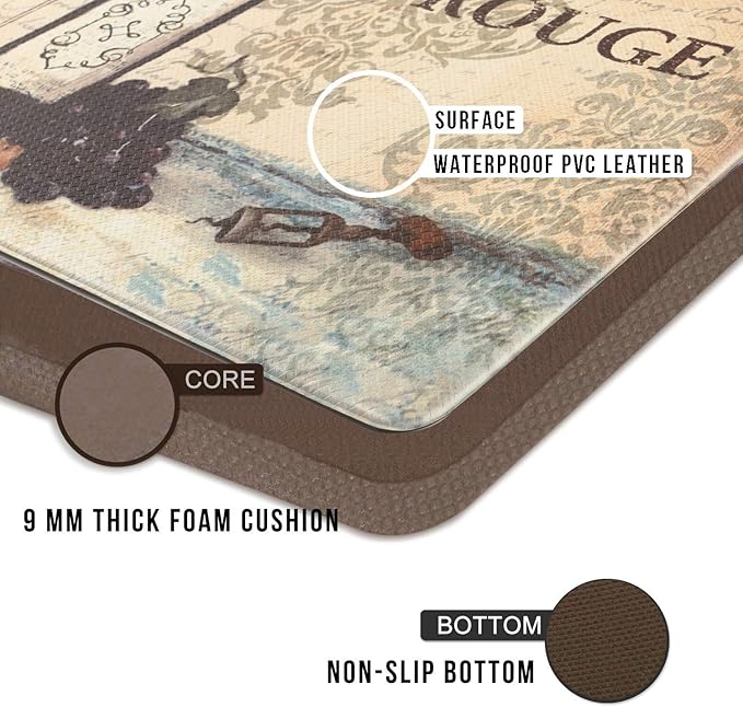 - Measures 17 x 30 + 17 x 47 inches. 0.4 inches cushioned anti-fatigue kitchen mats. Made of high-quality PVC Top and PVC foam backing. Nonskid backing holds the mat in place.