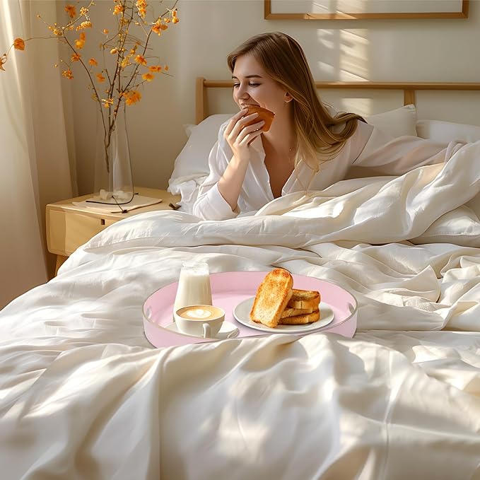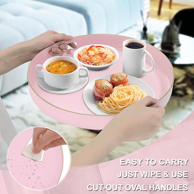 - PLASTIC SERVING TRAY: Round serving tray provide a stable surface for plates, cups, and utensils, making it easier to carry and enjoy your meal without spills. Not only can it be used as a breakfast tray for enjoying breakfast in bed, but it also be used as a perfume tray, bathroom vanity tray, jewelry tray, accessory tray and makeup tray.