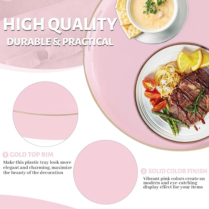 - TRAY DECOR: Pink tray is often used to present food and drinks in an appealing and organized manner. Round table tray can enhance the visual appeal of the items being served, making them more enticing to guests or customers. Also place it on your bathroom vanity as an exquisite showcase for perfumes, jewelry, or bath accessories.