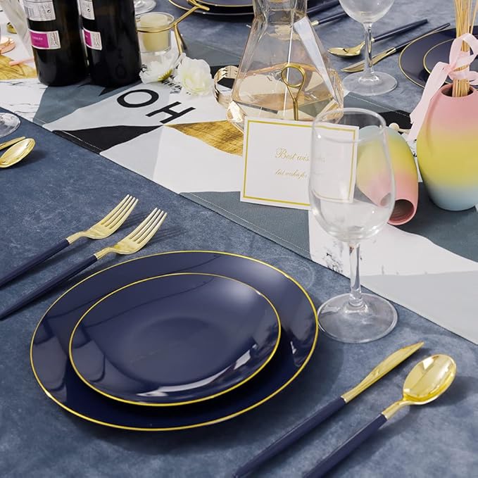 - SUIT ANY OCCASIONS - These blue gold plates ideal for serving appetizers, wedding cakes, beef and noddles that require the look of elegance. So the navy plastic plates with gold rim are suitable for birthday parties, banquet, graduation ceremonies, weddings and so on.