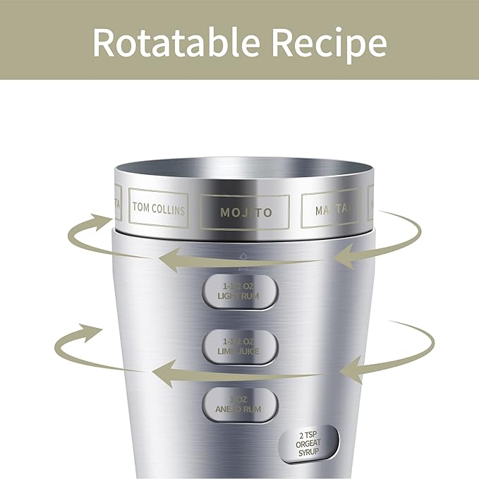- ROTATABLE RECIPE-This is the perfect cocktail shaker set for beginners. It is easy to use for mixing drinks in the comfort of your own home. There are a variety of cocktail recipes that are easy to use and help you make incredibly tasty drinks. It's perfect for home bars, special events, or parties.