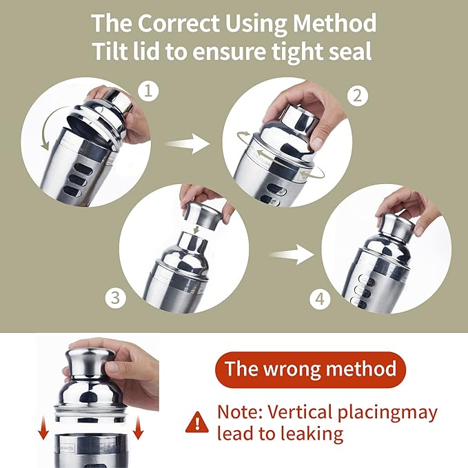 - BEST QUALITY - Cocktail making set is crafted from premium, glossy stainless steel that is anti-smudge and leak-proof. The martini shaker kit looks fashionable while being durable. All parts can be washed in the dishwasher and will not rust or corrode, making it very easy to clean.