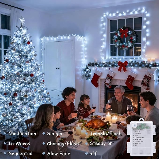 - 8 MODES BATTERY CHRISTMAS LIGHTS: There are a great variety of lighting mode options. You can decide how the 100 LED Battery Christmas lights shine: Combination,In wave,Sequential,Slo glo,Chasing/Flash,Slow fade,Twinkle/Flash,Steady on