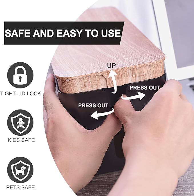 - [STYLISH MEETS PRACTICALITY] With a stylish black finish and simulated wood grain style lid fine design, it will blend neatly with any decor and look stunning. Simply place surge protectors and cords cables inside and close the lid, quick and easy use