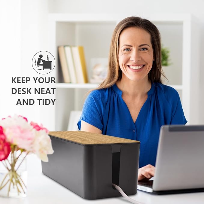 - [STYLISH & PRACTICALITY] Cable organizer box with a stylish black finish and simulated wood grain lid fine design,it will blend neatly with any decor and look stunning
