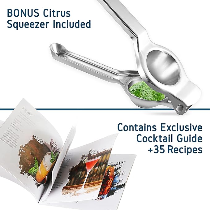 - Complete Cocktail Set: Cocktail mixer set includes: 2-piece Boston cocktail shaker, 30 oz; double sided jigger, mixing spoon, Hawthorne strainer, 6 liquor pourers, 7" flat bottle opener, citrus juicer, 2 stainless steel 3 oz shot glasses, and recipe booklet.