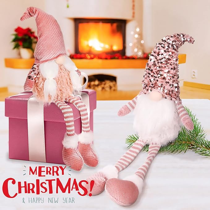 HMASYO Pink Couple Christmas Swedish Gnomes - 2Packs Handmade Swedish Tomte Santa Figurine Plush Elf with Sequin Hat, Long Leg Gnomes Plush Elf Xmas Decor Thanksgiving