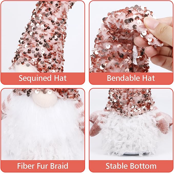 - FINE CRAFTSMANSHIP -- Short plush white beard & hair, pink knitted hat or sequins hat with long stripe leg, go particularly well with your festive decorations. Gnome plush doll features a weighted bottom for extra stability. 18.9 inches tall from leg to top of the hat, and 6 inches wide, The material is plush, knitwear, and felt, non-toxic and odorless.