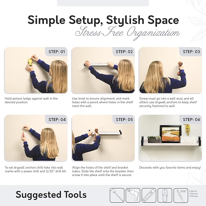- EASY TO INSTALL Includes an EZ Anchor system with all necessary hardware and instructions, making this wall mounted shelf quick and simple to set up.