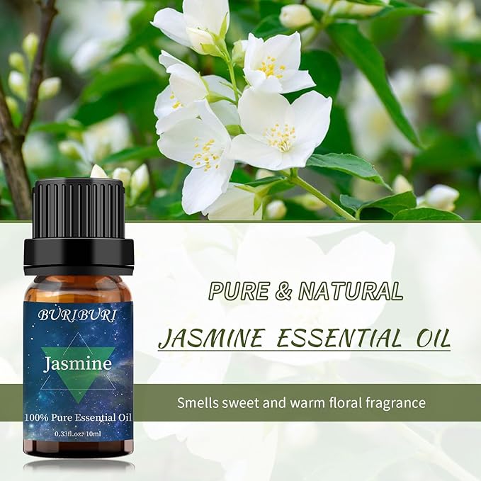 - Packing Includes: 10ml Vanilla Oil x1, 10ml Jasmine Oil x1. With no adulterants or dilution, 100% pure quality. BURIBURI scented oil is bottled in a durable amber glass bottle.