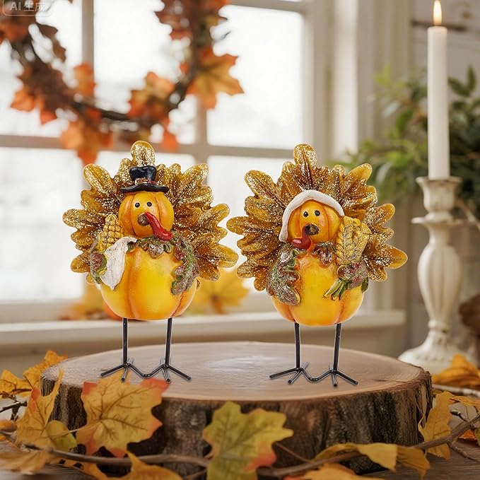 - π₯ Fall Decorations: Our turkey figurines are well made with exquisite workmanship is perfectly designed for Fall season. Mr. Turkey holds a corn and Mrs. Turkey carries wheat, both are crops of autumn, add a nice touch to Fall decor.