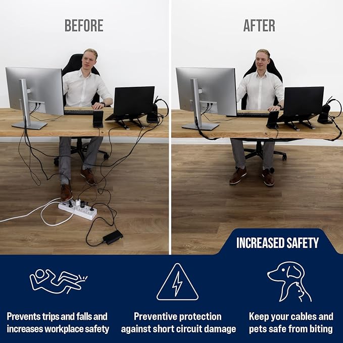 - Hide every cable! A flexible cable net under desk offers enough space to store all power supplies and plugs. Position the under desk cable management tray to sort all cables clips included and keep your cable tidy desk neat.