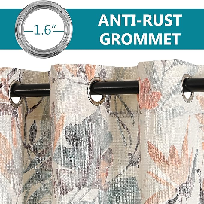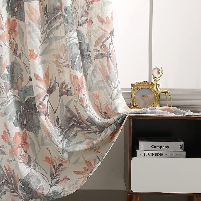 MYSKY HOME Coral Curtains 95 Inches Printed Cotton Grommet Linen Curtains for Living Room Light Filtering Curtain Burlap Effect Drape Window Treatments, 2 Panel Coral and Natural