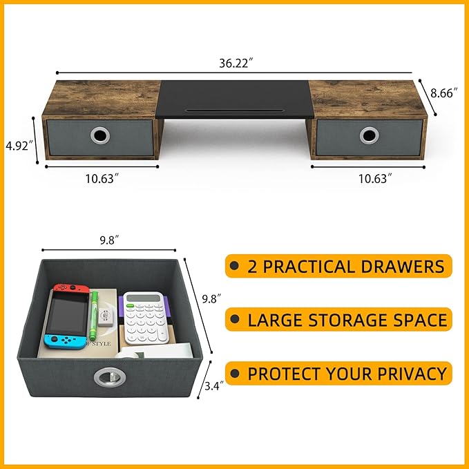- 【Monitor Stand with 2 Drawers】Our computer monitor riser includes slide-out drawers, for storing items like post-it notes, writing utensils and mobile devices