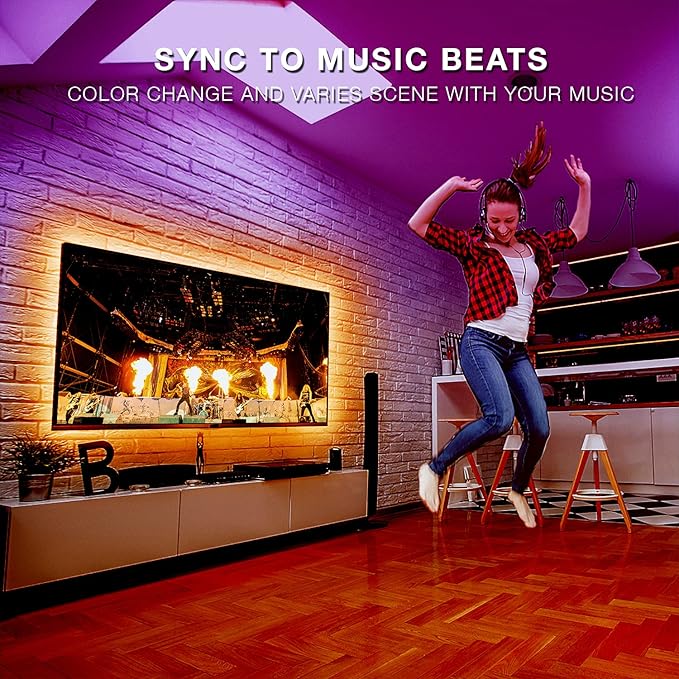 - Music Sync: With a built-in mic,whether you want to get party started or indulge in the exciting, intense computer game playing, the brightness and color of the LED lights for TV would change simultaneously while the USB input ambient music tempo shifts