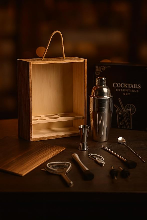 - SET IN WOODEN BOX: Shaker set, with rustic wooden box designed to keep your bar tools safe from scratches, keep your bar utensils organized, accessible with your bar tidy avoiding clutter in your drawers and the loss of tools keeping your set in style.