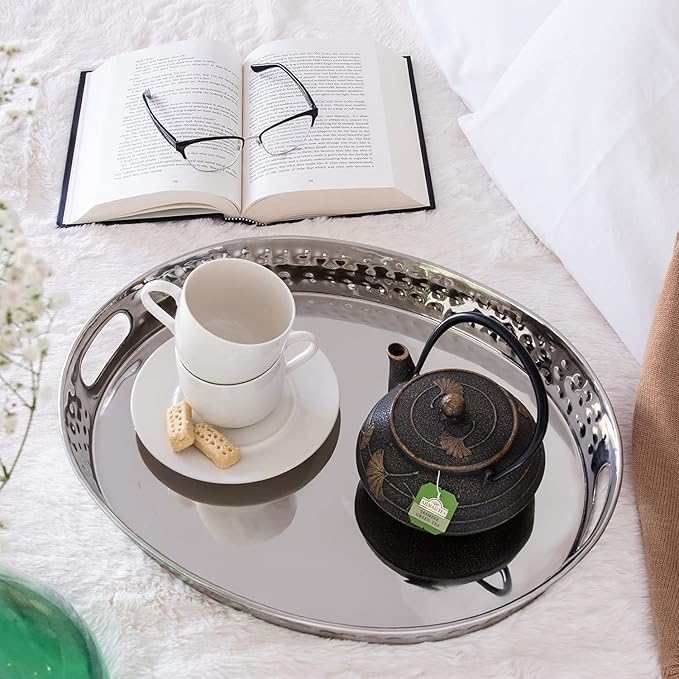 - STURDY AND LIGHTWEIGHT: Combining sturdy metal handles with a captivating hand-hammered rim, this serving tray with handles is lightweight yet resilient—designed to carry appetizers, icy beverages, desserts, or even act as a cookie platter with ease.