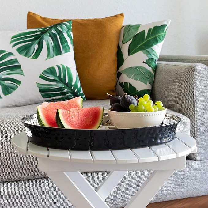 - IDEAL SIZE: Crafted at the perfect dimensions of 17" x 13" and a graceful oval shape in black and nickel finish, this tray with handles offers ample space to carry plates, cups, wine glasses, and dessert platters, making it the perfect brunch display tray for food or picnic tray for food.