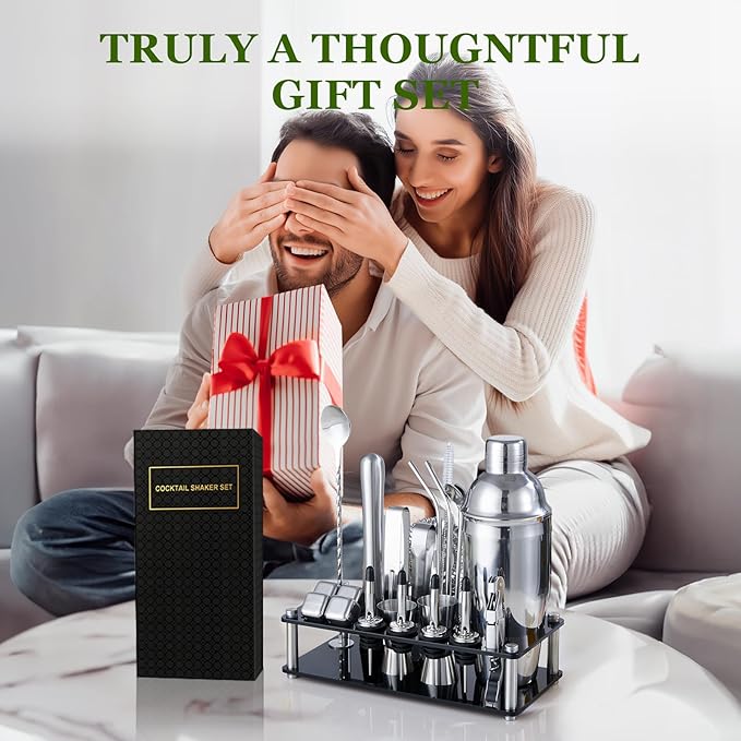 Cocktail Shaker Set, 23-Piece Stainless Steel Bartender Kit with Acrylic Stand & Cocktail Recipes Booklet, Professional Bar Tools for Drink Mixing, Home, Bar, Party (Include 4 Whiskey Stones)