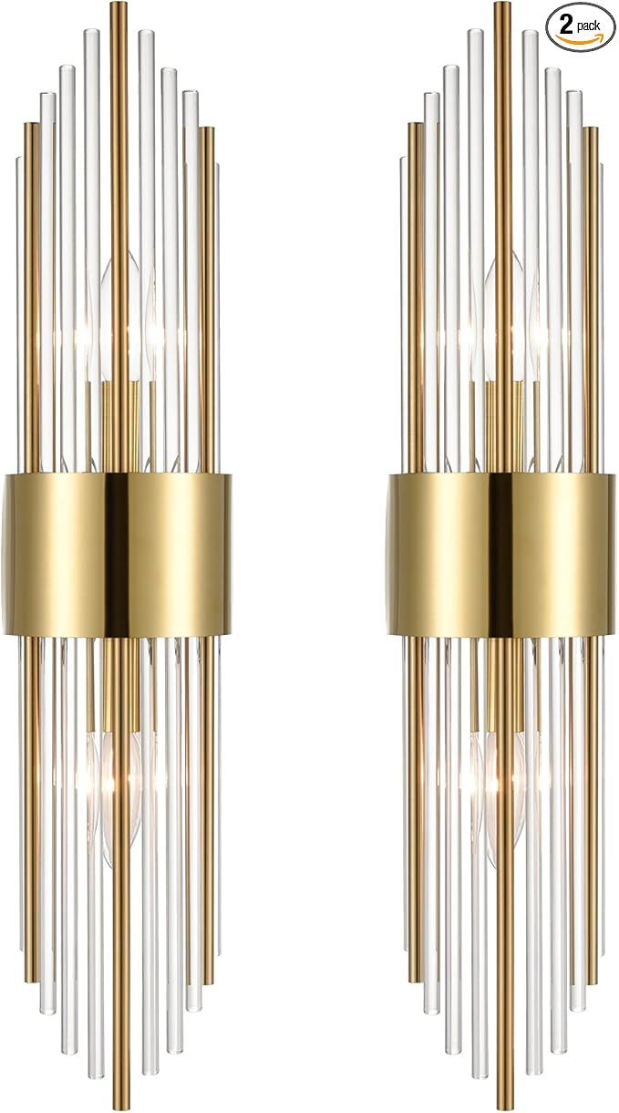 - Workmanship:The vanity wall sconces fixture made of welded stainless steel and crystal glass.The textured design of the gold metal with clear glass rods glass rods is brilliant and vanity.
