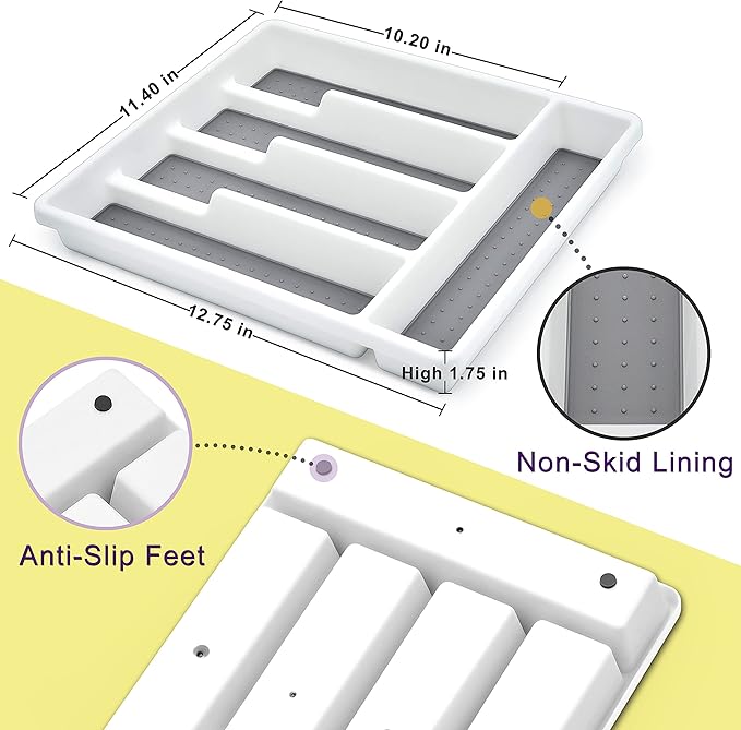 - Attached silverware organizer, our tableware set accompanied with a practical plastic drawer organizer, featured non-slip rubber feet and soft-grip lining keep it fixed in the drawer, and 5 slots constitute ample space for cutlery storage, perfect fits in most kitchen drawers