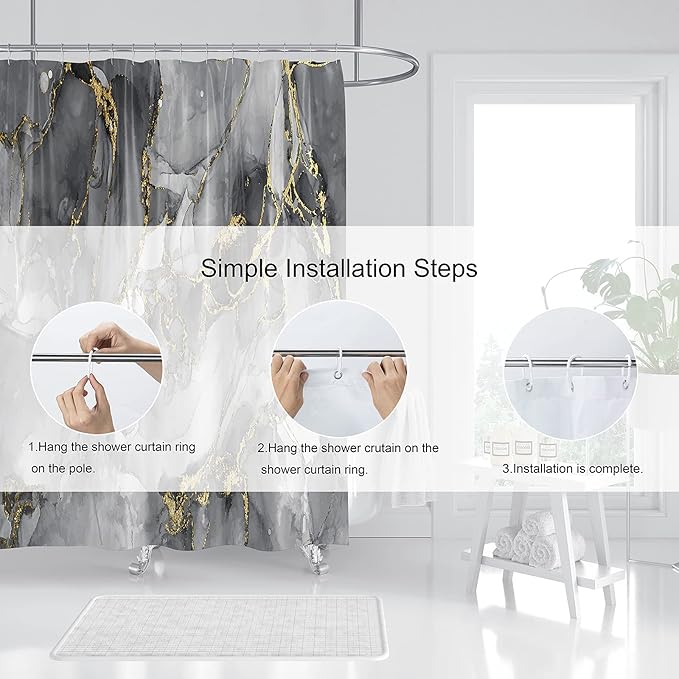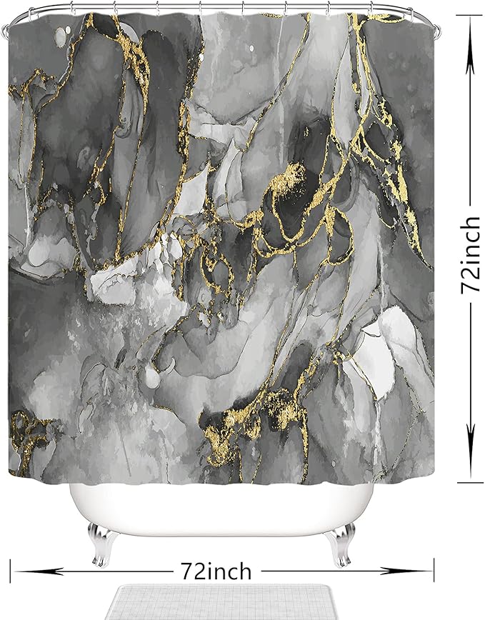 - ★【Installation and Dimensions】Installation for our shower curtain is a breeze. The black gold marble set comes with 12 rust-resistant metal grommets and 12 sturdy white hooks. These rust-resistant metal grommets prevent the marble curtain from tearing, ensuring better durability and a longer lifespan. The 72"x72" size is suitable for all standard bathtubs and shower stalls, whether they have straight or corner shower rods.