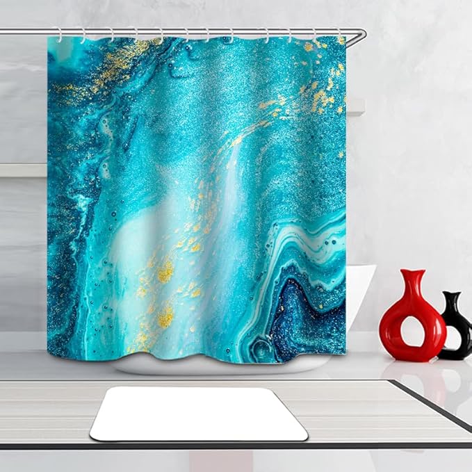 - ★【Installation and Dimensions】Installation for our shower curtain is a breeze. The blue-green gold marble set comes with 12 rust-resistant metal grommets and 12 sturdy white hooks. These rust-resistant metal grommets prevent the marble curtain from tearing, ensuring better durability and a longer lifespan. The 72"x72" size is suitable for all standard bathtubs and shower stalls, whether they have straight or corner shower rods.
