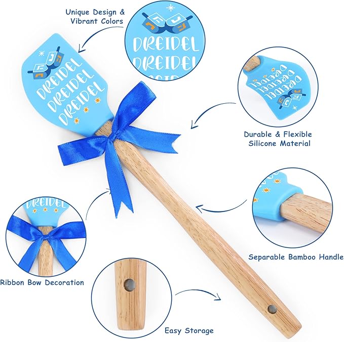 - Hanukkah Silicone Spatula Set: There are 4 items in the package. 1 is "Light it up" silicone spatula with a baby blue ribbon bow, 1 is "Oy, to the world" silicone spatula with a white ribbon bow, 1 is "dreidel dreidel dreidel" silicone spatula with a dark blue ribbon bow and the last one is an Happy Hanukkah greeting card. We add the classic elements like dreidel, menorah and star in the design
