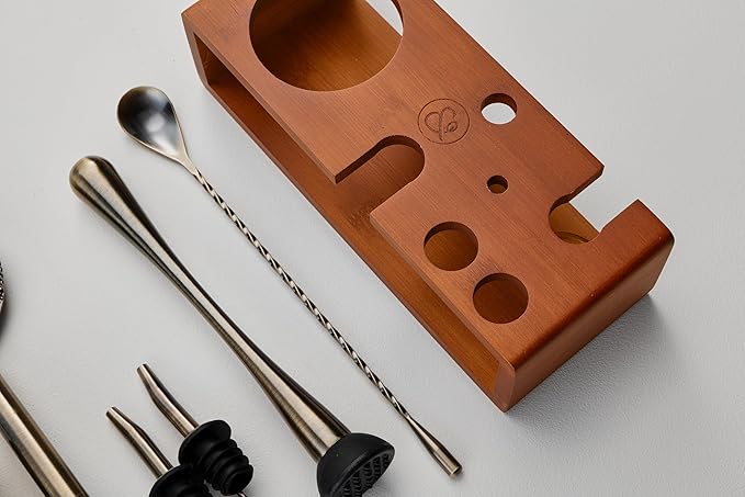 - CAREFULLY DESIGNED TO BLEND IN WITH YOUR HOME: Our beautiful shaker set is crafted to ensure your drinks are made in style. Forget the clutter, our sustainable bamboo stand allows you to display or store your cocktail mixer set organized and scratch-free. This bar shaker set will enhance your home or bar decor when not in use.