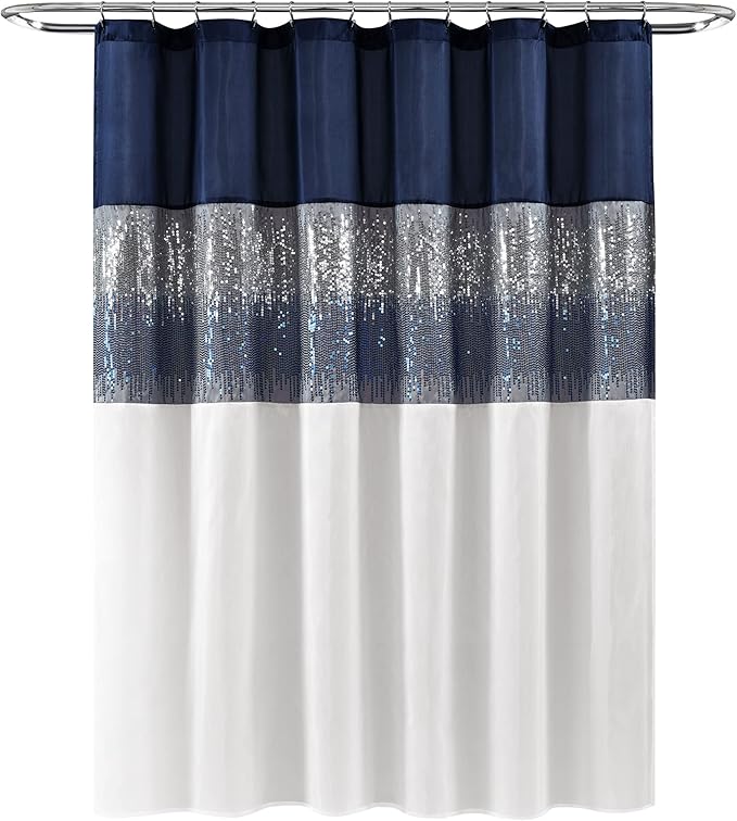 Lush Decor Night Sky Shower Curtain, Single, 72" W x 84" L, Navy & White - Sequin Shower Curtain - Sparkly Color Block Bath Curtain - Modern Glam Bathroom Decor - Extra Long Shower Curtain