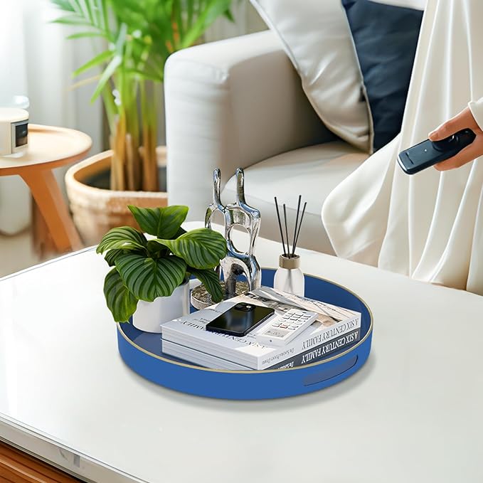 - EASY TO CLEANING: Coffee table tray featuring a classic round design with a navy blue glossy finish and golden top edging, brings a elegance and adds a beautiful touch. Modern blue serving tray has a smooth surface that is waterproof and easy to clean, just use a damp cloth to clean.