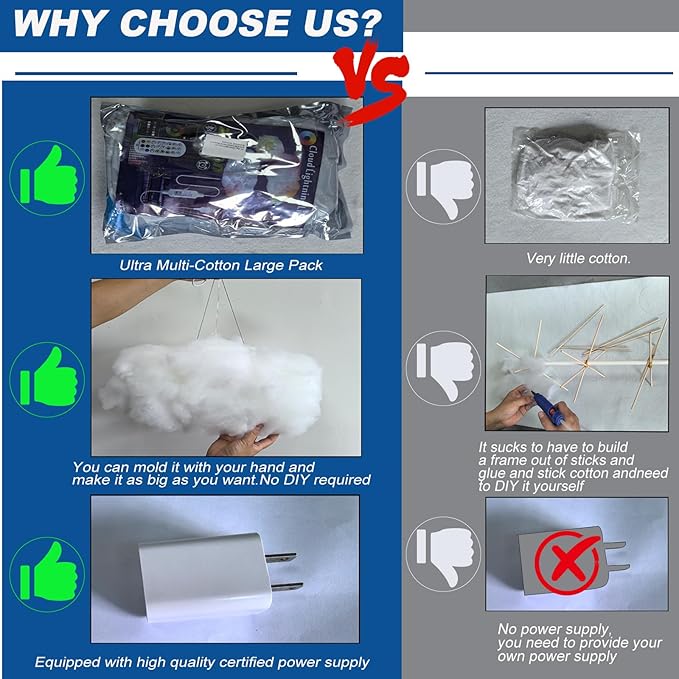 - ⚡Easy to Use and Install:It is easy to Install, just put the ceiling buckle wherever you want to decorate.And take the cloud lamp out of the compression bag and grab it slightly to hang it up. Power by USB,can be used any devices with 5V adapter.Such as USB socket ,USB connector,Power bank.