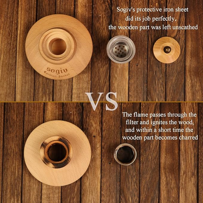 - 【WHAT'S INCLUDED】Cocktail smoking kit,with exquisite design and delicate packaging,including a smoke infuser,a butane torch,a cleaning brush,filter and 4 different flavor wood chips of apple,cherry, oak,and walnut without artificial fragrance ingredients.4 reusable ice cubes.Our chips are air-dried to a suitable humidity,and crushed into a suitable particle size for full combustion,which can guarantee the most original and pure smoky taste