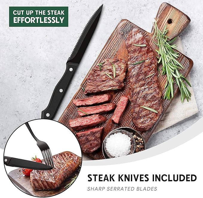 - STEAK KNIVES INCLUDED IN THE SET! They’re 8 steak knives that are more than the normal set, no need to go and buy another steak knife to use, and the included ones works very well. The sharp serrations that are easy to slice steaks or disassemble a turkey. The triple riveting handle is strong and durable even when cut hard, and the ergonomic design makes it very comfortable to hold.