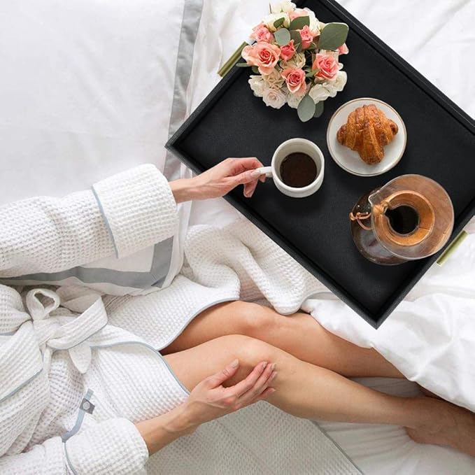 HofferRuffer Extra Large Serving Tray with Handles, Elegant Faux Leather Storage Decorative Tray for Coffee Table, Ottoman, Console Table, 20 x 16 x 2.2 inches (Black Tray+Golden Handle)